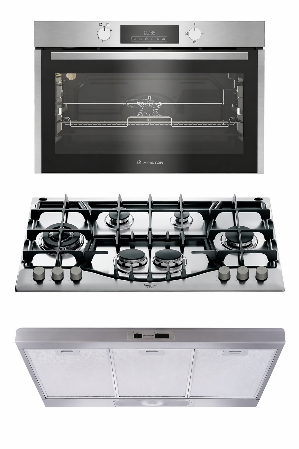 Upgrade your kitchen with Ariston Built-In Cooking Bundle, a complete solution that combines power, style, and convenience. This premium set includes a 90 cm gas hob, a matching hood, and a built-in gas oven, all crafted in elegant stainless steel to deliver a seamless and modern kitchen experience.